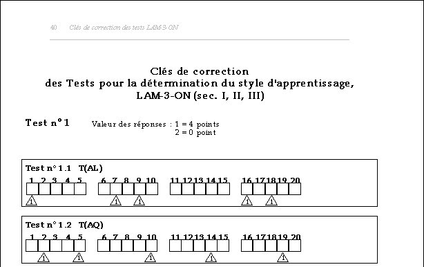 Les Clés de correction qui sont présentées à l'annexe 5, peuvent être utilisées pour répondre à trois besoins particuliers : le premier, une introduction rapide aux divers comportements observables qui définissent l'une ou l'autre composante du domaine respectif de chacune des variables du profil d'apprentissage; le second, l'analyse plus approfondie des réponses d'un individu pour chacune des variables de son profil d'apprentissage ou encore pour l'une d'entre elles suite à une question de l'individu, question qui peut orienter l'analyse de son profil d'apprentissage et poser un jalon important pour une éventuelle prescription d'apprentissage; le troisième, la correction et la compilation des réponses d'un individu aux tests LAM-3-ONE pour la mise au point de son profil d'apprentissage.