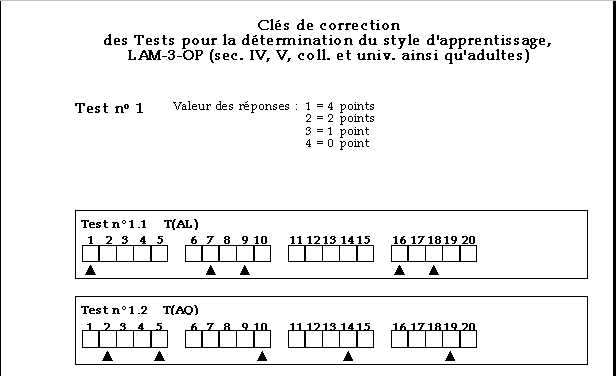 Les Clés de correction qui sont présentées à l'annexe 5, peuvent être utilisées pour répondre à trois besoins particuliers : le premier, une introduction rapide aux divers comportements observables qui définissent l'une ou l'autre composante du domaine respectif de chacune des variables du profil d'apprentissage; le second, l'analyse plus approfondie des réponses d'un individu pour chacune des variables de son profil d'apprentissage ou encore pour l'une d'entre elles suite à une question de l'individu, question qui peut orienter l'analyse de son profil d'apprentissage et poser un jalon important pour une éventuelle prescription d'apprentissage; le troisième, la correction et la compilation des réponses d'un individu aux tests LAM-3-OPE et LAM-3-OPA pour la mise au point de son profil d'apprentissage.