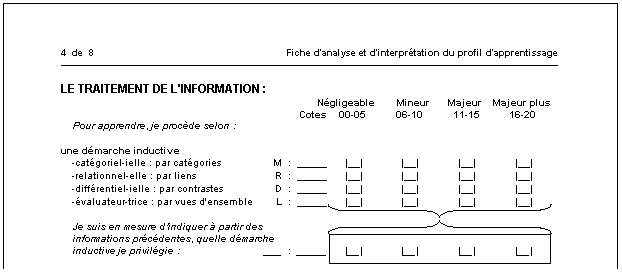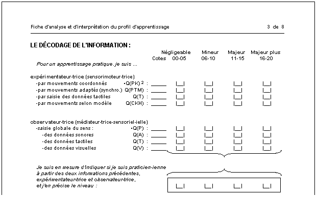1- J'inscris la cote que j'ai obtenue pour chaque caractéristique de mon profil d'apprentissage à la droite de son sigle : il est situé vers le centre de la page sur la gauche.