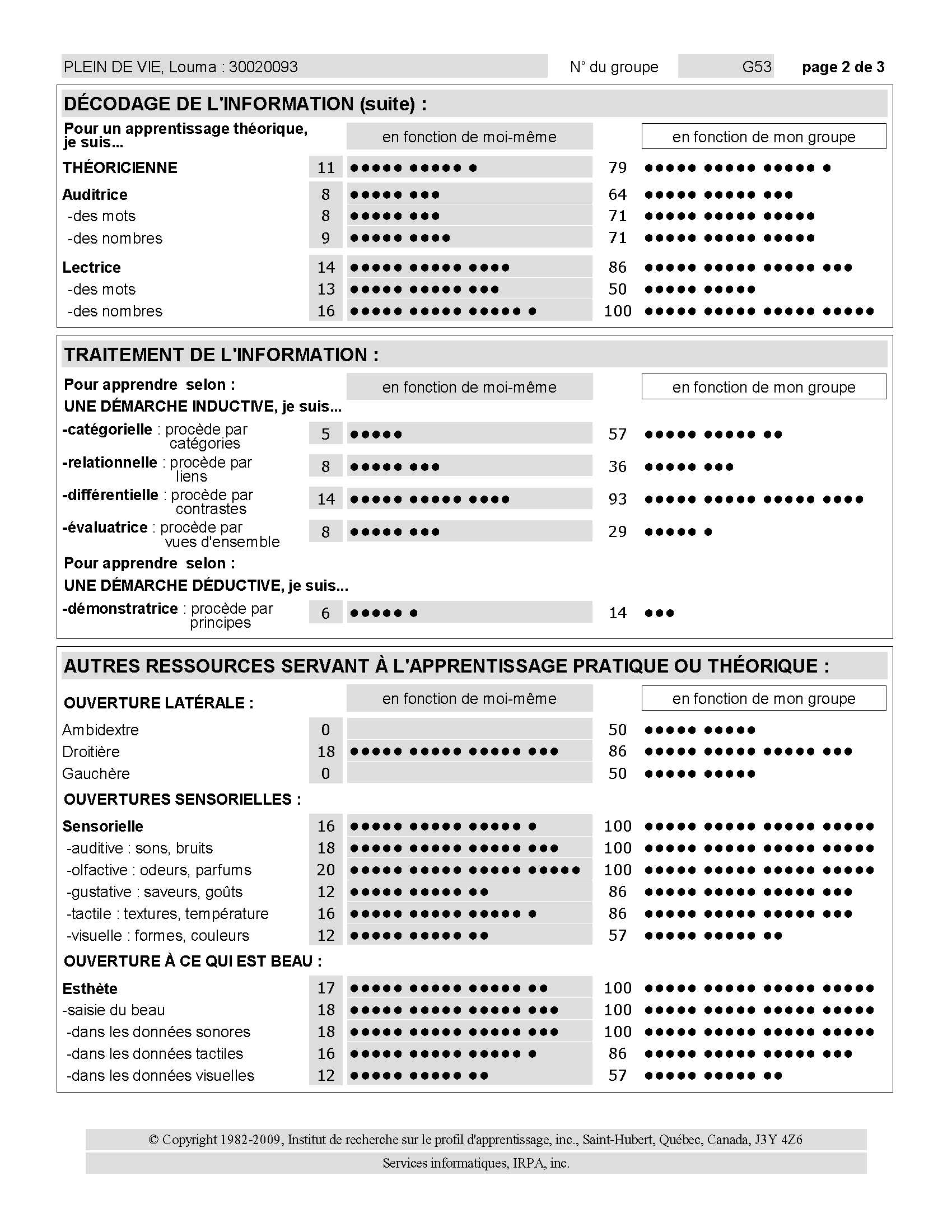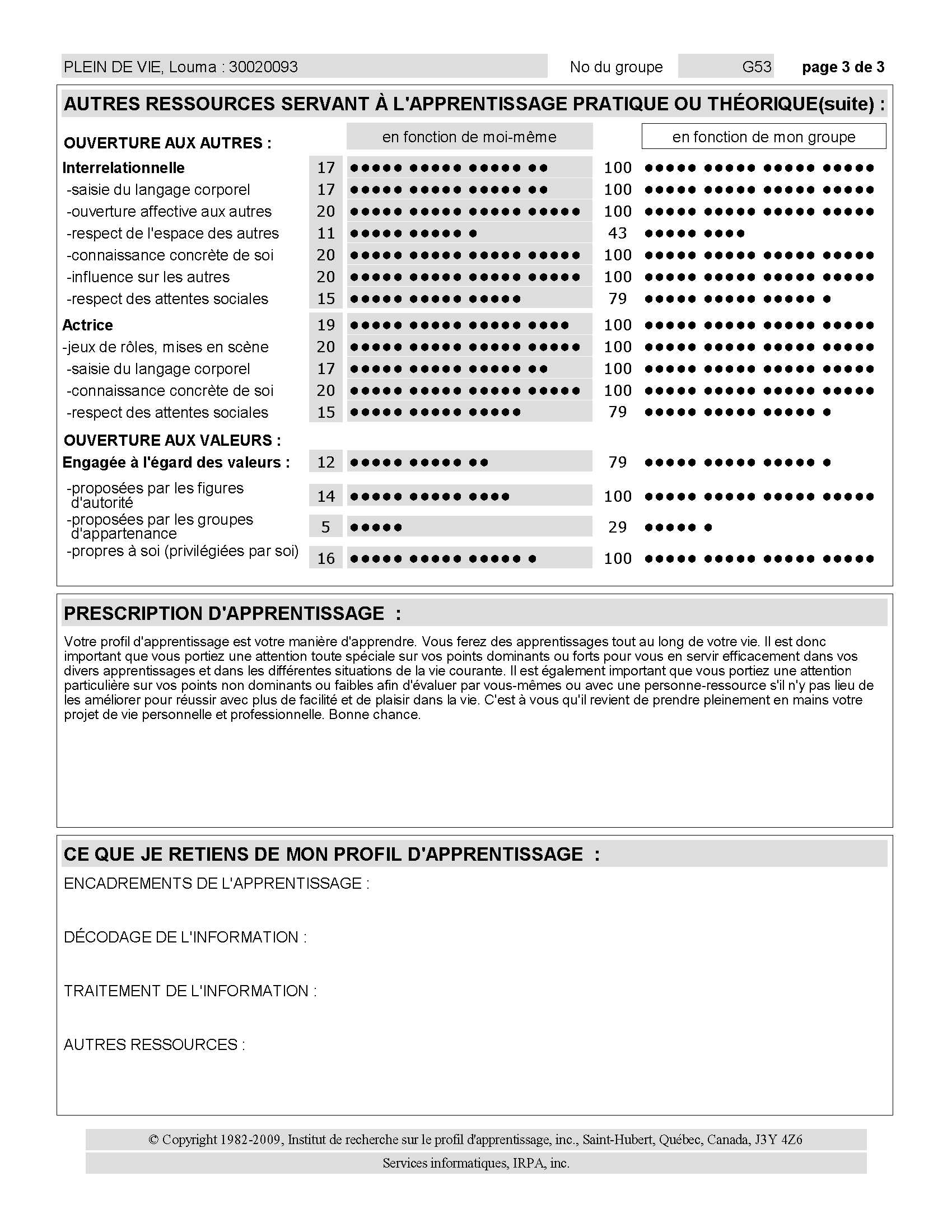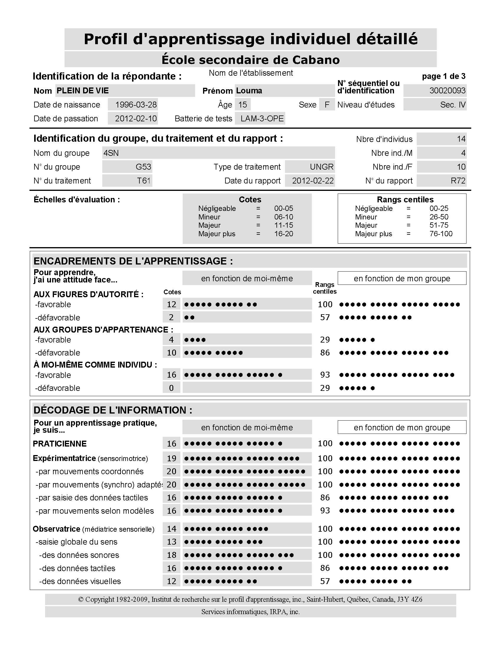 Cette année, lenseignante nous a fait part de son intérêt à répéter lexpérience de juin 2009 (Annexe 1, p. 8). Elle sest chargée dintéresser les élèves aux données fournies par le PAI. Sous son regard attentif, les élèves ont rempli le questionnaire comportant huit sous-tests. Les feuilles réponses du LAM-3-OPE furent par la suite expédiées à lIRPA (Institut de recherche pour le profil dapprentissage) afin quelles soient traitées et que soient produits les trente-trois (33) PAI et les deux (2) profils collectifs.